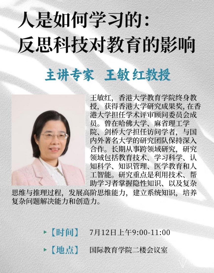 王敏红,香港大学教育学院终身教授,获得香港大学研究成果奖, 在香港大学担任学术评审顾问委员会成员。曾在哈佛大学、麻省理工学院、剑桥大学担任访问学者,与国内外著名大学的研究团队保持深入合作。长期从事跨领域研究,研究领域包括教育技术、学习科学、认知科学、知识管理、医学教育和人工智能。研究重点是利用技术、帮助学习者掌握隐性知识、以及复杂思维与推理过程,发展高阶思维能力,建立系统知识,培养复杂问题解决能力和创造力。