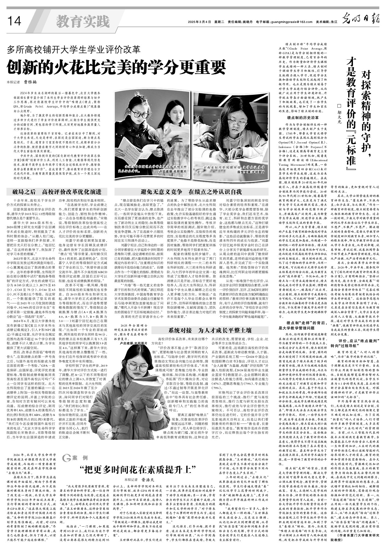 教育的终极目标和智慧,在于理解成长是不可计量的。当我们停止用数字切割思维的整体性,当制度能够宽容那些暂时无法被量化的思考沉淀,当学生不再为0.1分的得失焦虑,真正的创新才会在留白处自然生发。对探索精神的守护,才是教育评价应该回归的“元标准”。