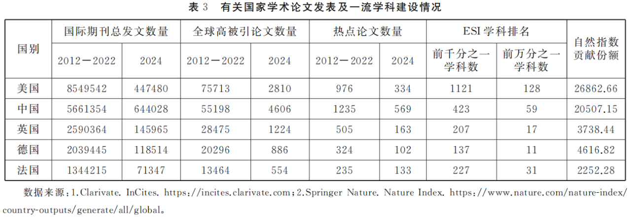 从共时视角来看,我国知识创新的加速发展更为明显。InCites平台发布的数据显示,在2024年⑧,我国学者在国际期刊中的论文发表量为644028篇,高引用论文数量4606篇,热点论文数量569篇,均超过美国,位于世界第一位。[31]以上数据反映了近年来我国以高校为代表的科研组织的国际影响力逐步扩大,我国学者逐渐走向国际学术舞台的中央,与全球学者展开密切合作与对话;我国科技创新开始从“跟跑”向“并行”转变,甚至在部分领域处于“领跑”位置,实现了质量与规模的双重提升。